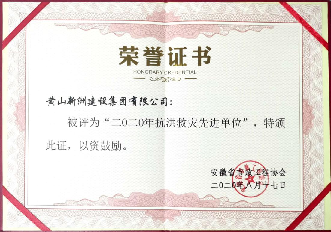2020年8月17日,黃山新洲建設(shè)集團(tuán)有限公司榮獲“2020年抗洪救災(zāi)先進(jìn)單位”稱號。