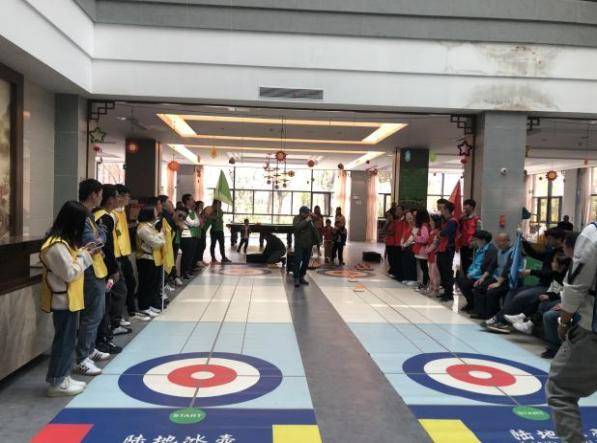 最后一個項(xiàng)目“旱地冰壺”,以小組為單位,在平滑的地面上進(jìn)行投擲的競賽項(xiàng)目。通過讓自己的壺停放在預(yù)設(shè)好的位置,或?qū)Ψ角驌舫?,達(dá)到制勝的目的。這項(xiàng)競賽集智慧、戰(zhàn)術(shù)、判斷、技巧、把握時機(jī)的能力為一體,充分發(fā)揚(yáng)了雙方隊(duì)員誠實(shí)信任的體育精神。