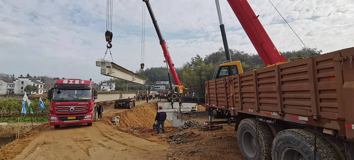 2021年12月15日上午10點55分,隨著最后一片混凝土梁板穩(wěn)穩(wěn)地落在橋梁支座上,歙縣跳石至呈坎農(nóng)村道路改建工程鮑家橋梁板吊裝工作順利完成。