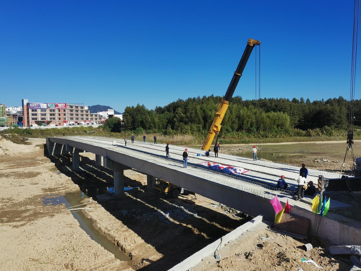 伴隨著最后一片箱梁吊裝到位,春秋黟城鐘山湖橋12片箱梁全部架設(shè)完成。根據(jù)施工組織設(shè)計的要求,鐘山湖橋采用箱梁現(xiàn)場預(yù)制、輪胎起重機吊運施工。先將預(yù)制好的箱梁經(jīng)運梁車運送至指定地點,通過輪胎起重機吊運,經(jīng)過調(diào)節(jié)至設(shè)計位置,完成架設(shè)。