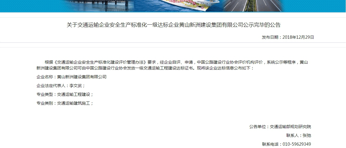 近日從交通運輸企業(yè)安全生產(chǎn)標(biāo)準(zhǔn)化管理系統(tǒng)獲悉,黃山新洲建設(shè)集團(tuán)有限公司交通運輸部安全生產(chǎn)標(biāo)準(zhǔn)化一級達(dá)標(biāo)已公告,標(biāo)志著我集團(tuán)公司的交通建設(shè)工程安全生產(chǎn)標(biāo)準(zhǔn)化工作上升了一個新的臺階。自2018年1月份開始至今安全生產(chǎn)標(biāo)準(zhǔn)化創(chuàng)標(biāo)工作經(jīng)過一年多的申報、現(xiàn)場考核、考評工作圓滿結(jié)束。